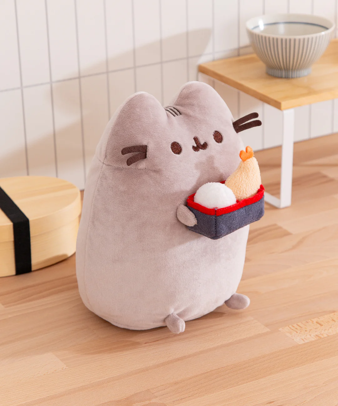 When itâs time for a delicious meal, Pusheenâs already one step ahead. This adorable 9.5â plush features Pusheen about to enjoy some umami snacks with soft gray plush, brown embroidered details, and a huggable body weighted with pellets that keep her balanced upright. She clutches an adorable blue bento box meal, filled with fluffy white rice and crispy shrimp tempura for a hearty and satisfying treat. Itâs the perfect addition to any foodieâs collection!Â
