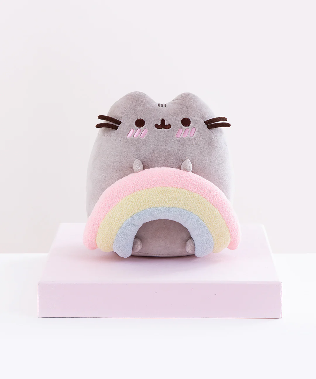 - Medium sized plush features a blushing Pusheen holding a soft rainbow.